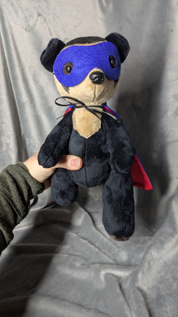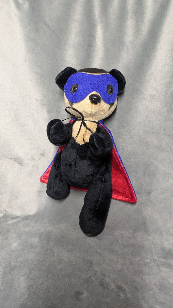 The design is based on our Spectacled Bear, which already has that perfect little “mask” face. To make him extra heroic, he wears a royal blue superhero mask and cape, lined in red with his name embroidered on the back.