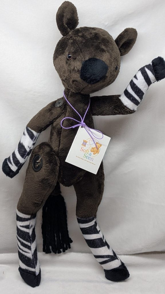 This realistic Okapi plush is carefully handmade to be soft, cuddly, and inclusive. Every detail is crafted with love, from its gentle shape to its poseable button-jointed shoulders and hips. It stands approximately 17 inches tall and is designed to bring comfort, joy, and a sense of being seen.