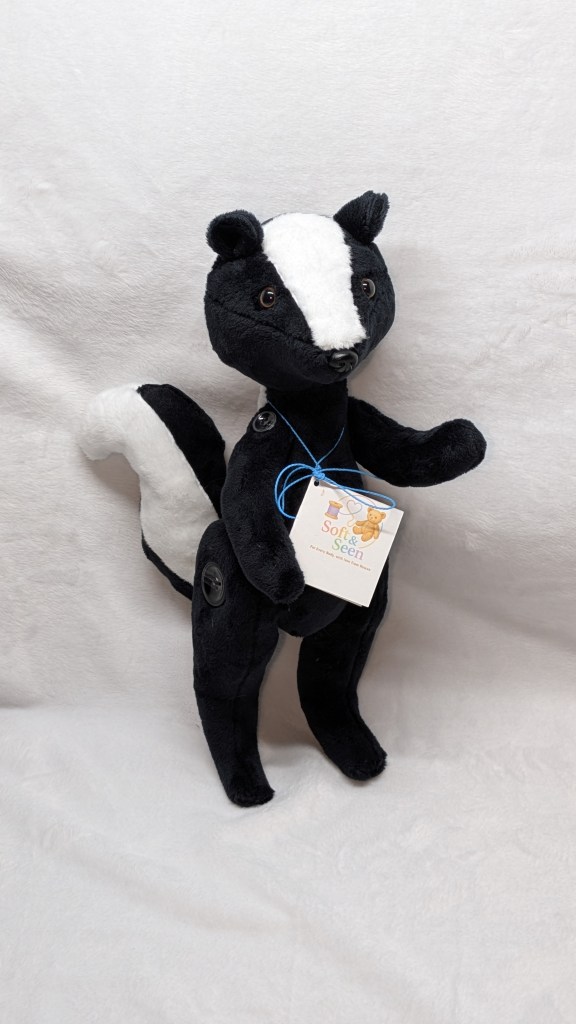 This realistic Skunk plush is carefully handmade to be soft, cuddly, and inclusive. Every detail is crafted with love, from its gentle shape to its poseable button-jointed shoulders and hips. It stands approximately 13 inches tall and is designed to bring comfort, joy, and a sense of being seen.
